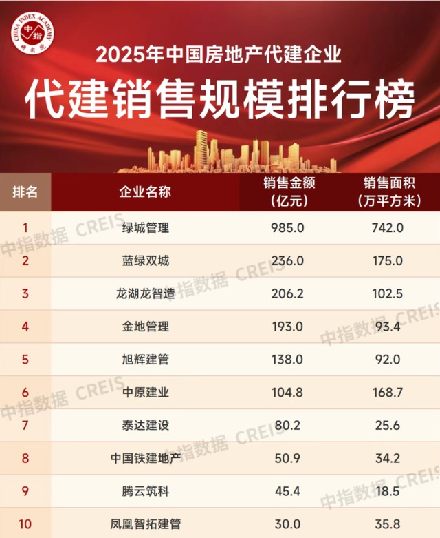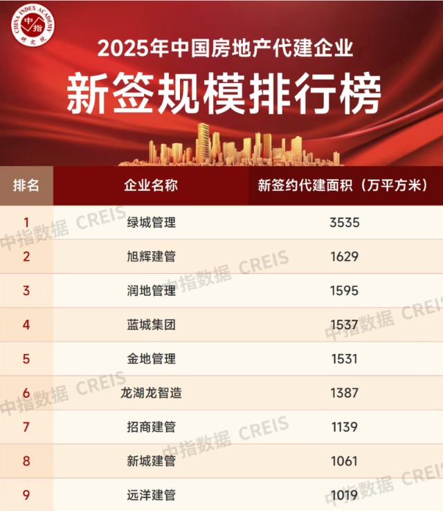 1月6日晚间,中指研究院发布的《2025年中国房地产代建企业新签规模排行榜》显示,2025年,绿城管理以3535万平方米新签约规模位列第一,遥遥领先。旭辉建管和润地管理代建新签约面积分别为1629万平方米和1595万平方米,旭辉建管位列二、三位,处于领先地位。