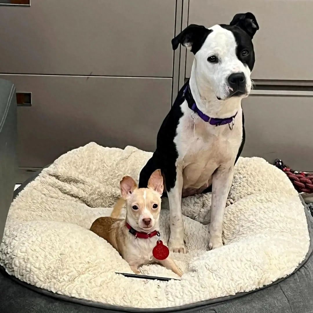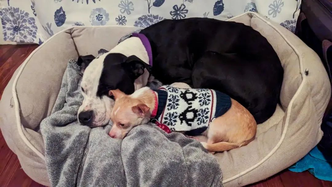 5岁的大狗子Karma和2岁的吉娃娃Gigi,是被救援人员从同一个家里救出来的,又被一起送进了收容所里...