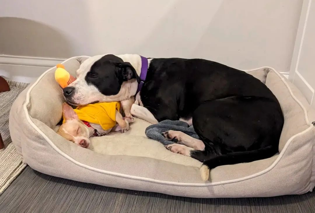 工作人员想着,待在熟悉的狗旁边或许能缓解Karma的不安,就把它俩安排在了一个狗窝里。